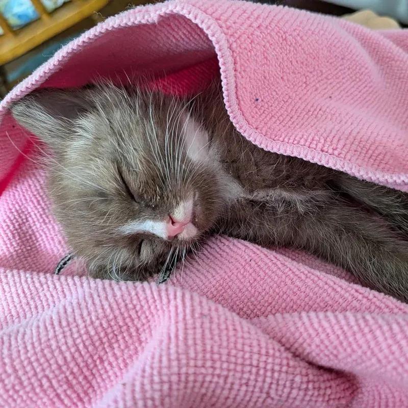 这只名叫可可的小猫,裹着小毛毯,很快就舒焕发服地睡着了。